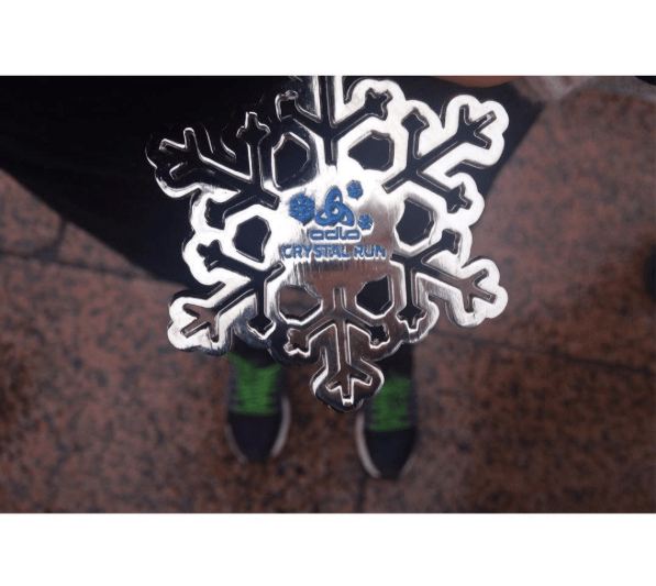 Le parcours passe assez vite avec tous ces divertissements et l’arrivée pointe déjà le bout de son nez. On me remet une jolie paire de lunettes bleues “Odlo”, plutôt pour cacher la fatigue que pour contrer le soleil 😉 et la médaille. Une jolie médaille en forme de flocon! 😀