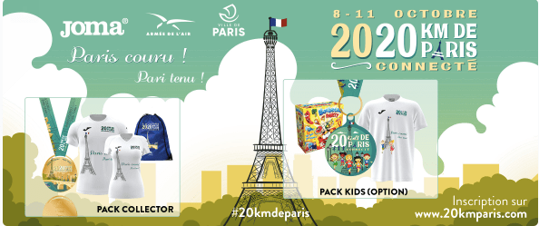Cette année, les 20 km de Paris se feront sous un format connecté. Coureurs, marcheurs, seuls ou en groupe, du jeudi 8 octobre au dimanche 11 octobre 2020 c’est à vous!!