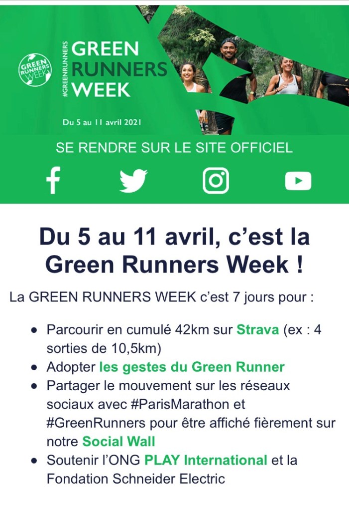 Challenge green runners week : prendre soin de soi tout en protégeant la nature. 7 jours pour courir le marathon de Paris. RDV sur strava pour s’inscrire gratuitement au challenge ou cliquer sur ce lien