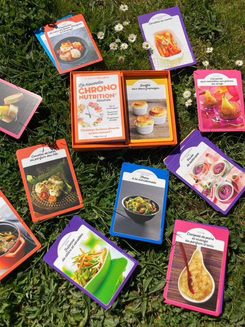 Le coffret La nouvelle chrono nutrition illustrée vous propose 50 fiches recettes catégorisées par couleurs : jaune pour le petit déjeuner, bleu clair pour le déjeuner, bleu foncé pour l’accompagnement déjeuner : rose pour le gouter ; orange pour le diner et violet pour l’accompagnement diner
